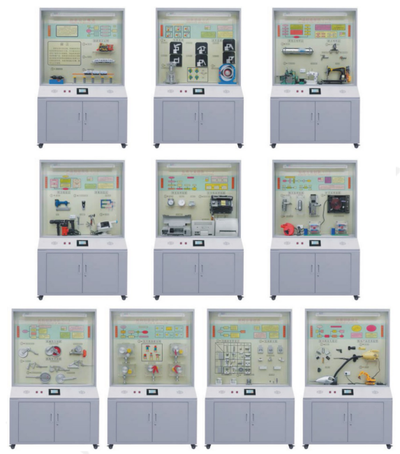 5、柜顶部装有照明日光灯,柜背设有对开门,有利维护设备和方便维修。柜下部设有柜箱,方便存放单个模型、实验箱及相关实验文档。柜底装有万向轮,方便移动,符合人机工程要求。