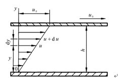 当液体流动时,由于液体与固体壁面的附着力及流体本身的粘性使流体内各处的速度大小不等,以流体沿如图2-2所示的平行平板间的流动情况为例,设上平板以速度u0向右运动,下平板固定不动。紧贴于上平板上的流体粘附于上平板上,其速度与上平板相同。紧贴于下平板上的流体粘附于下平板图2-2液体的粘性示意图上,其速度为零。中间流体的速度按线性分布。我们把这种流动看成是许多无限薄的流体层在运动,当运动较快的流体层在运动较慢的流体层上滑过时,两层间由于粘性就产生内摩擦力的作用。根据实际测定的数据所知,流体层间的内摩擦力F与流体层的接触面积A及流体层的相对流速du成正比,而与此二流体层间的距离dz成反比,即:F=μAdu/dz